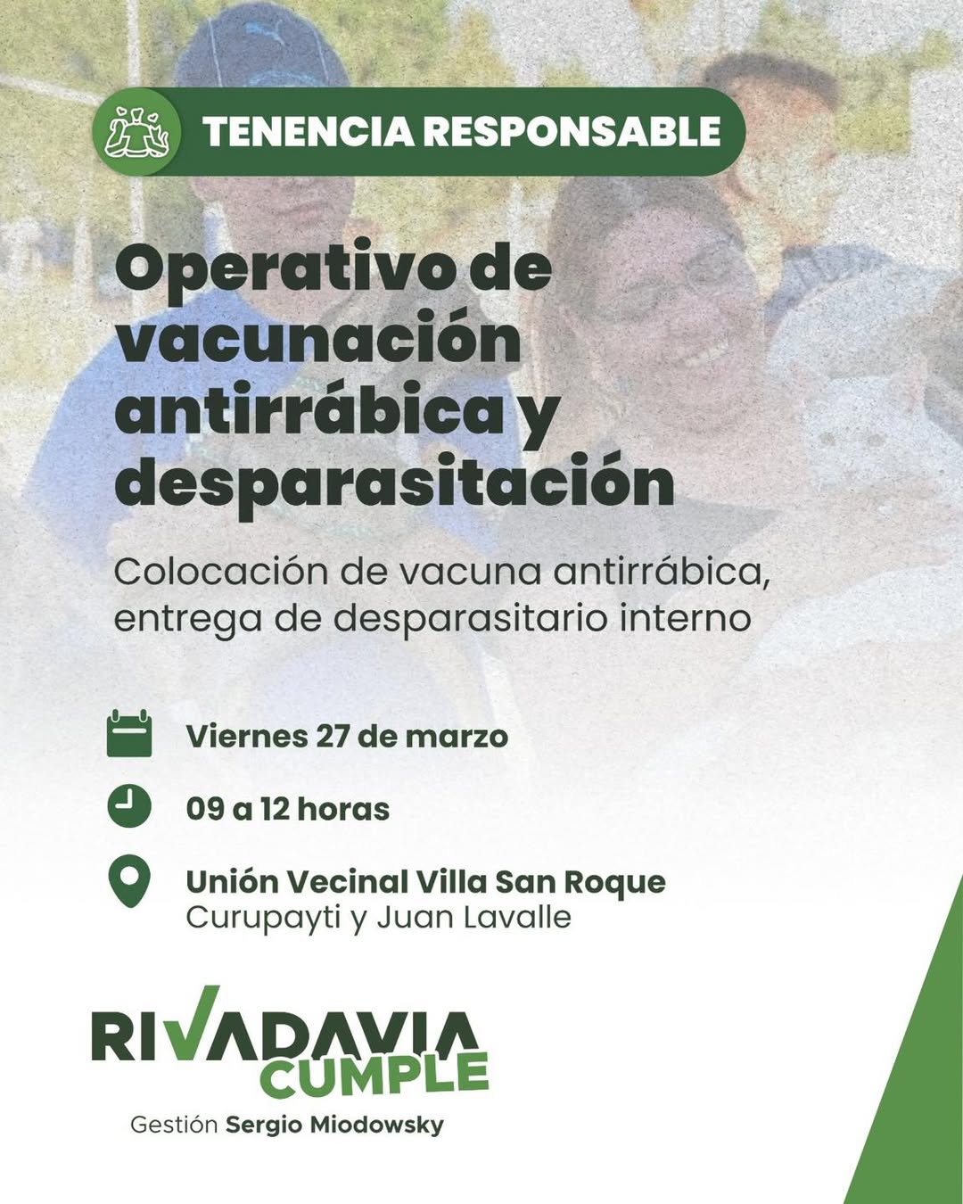 Un nuevo operativo de vacunación antirrábica y desparasitación llega a la Unión Vecinal de Villa San Roque. 📅 Viernes 27